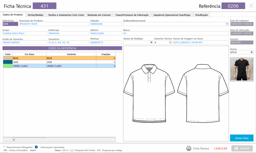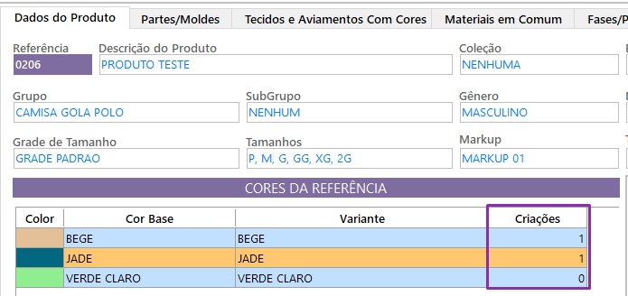 Aqui estarão todas as informações principais da referência: código, descrição, tamanhos, cores, grade, entre outros.