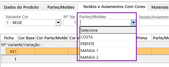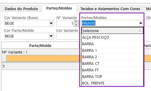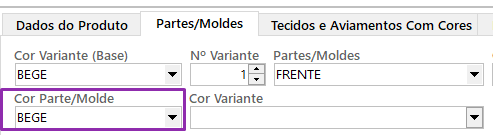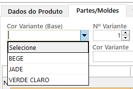 – Cor Variante (Base): selecione a cor base da referência. Após selecionar a cor, o campo “Cor Parte/Molde” será preenchido automaticamente ao dar um clique em qualquer lugar da tela.