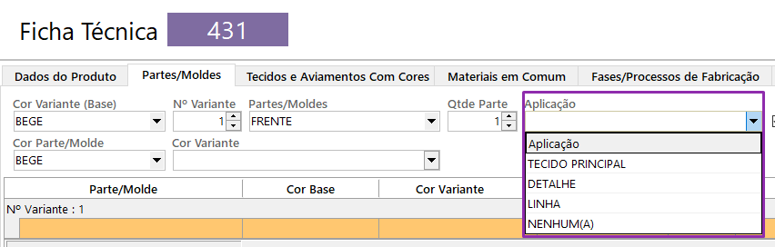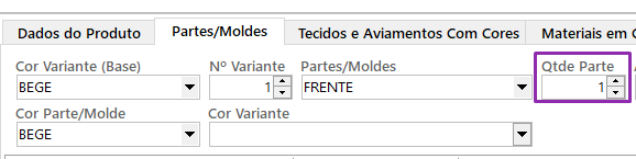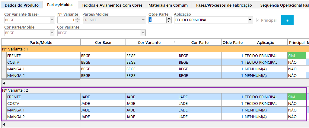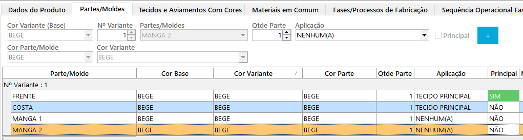 Nesta aba você adiciona as partes da peça por variante de cor.