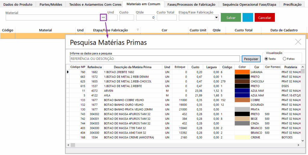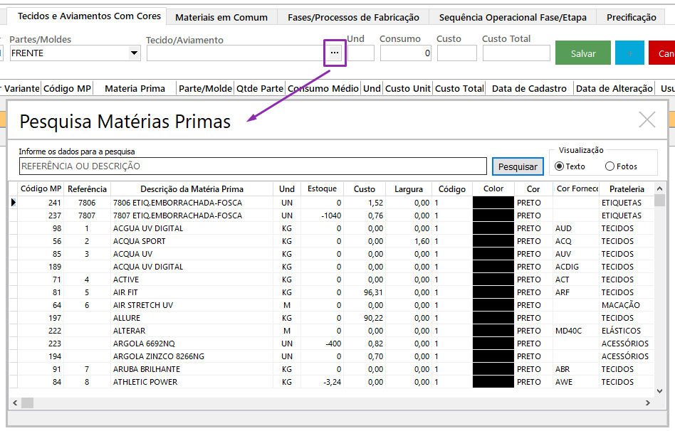 – Custo: valor trazido automaticamente do cadastro do tecido ou aviamento, podendo ser alterado na ficha.