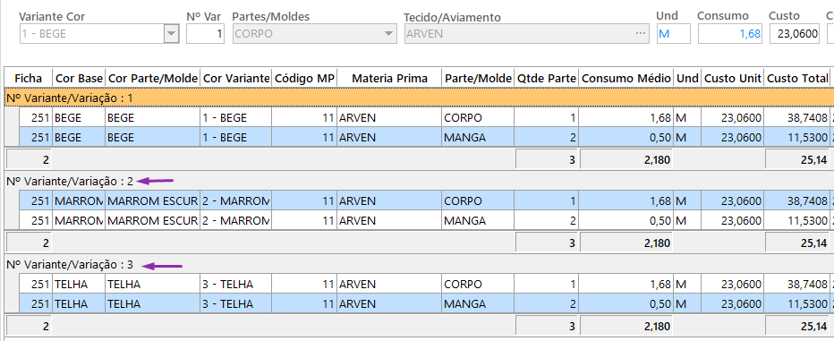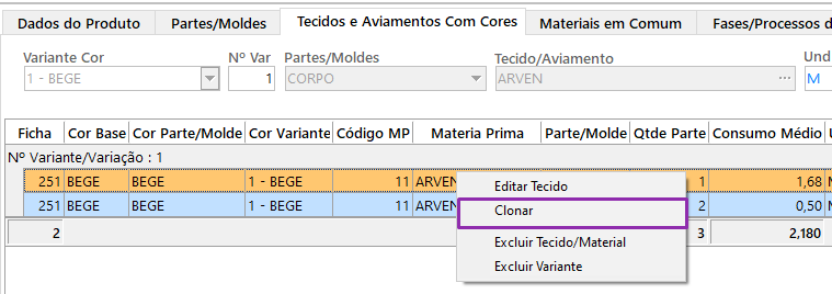 – O sistema irá replicar automaticamente os registros para todas as demais cores cadastradas na aba Partes/Moldes, utilizando os tecidos e consumos definidos na primeira cor.