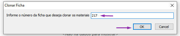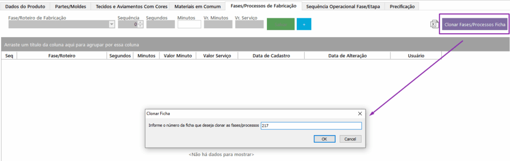 Para isso, clique no botão “Clonar Fases/Processos Ficha” e informe o número da ficha desejada.