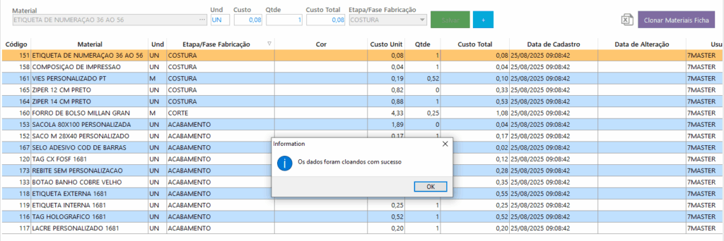 Para facilitar, o sistema tem uma funcionalidade que você pode clonar materiais de outra ficha: