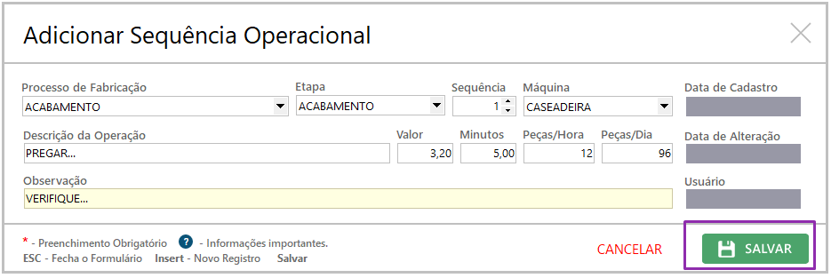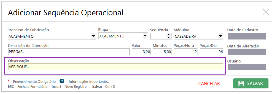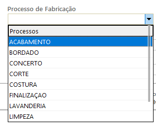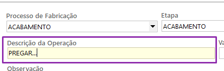 – Processo de Fabricação: define em qual parte da produção a operação será realizada (ex.: costura, acabamento).