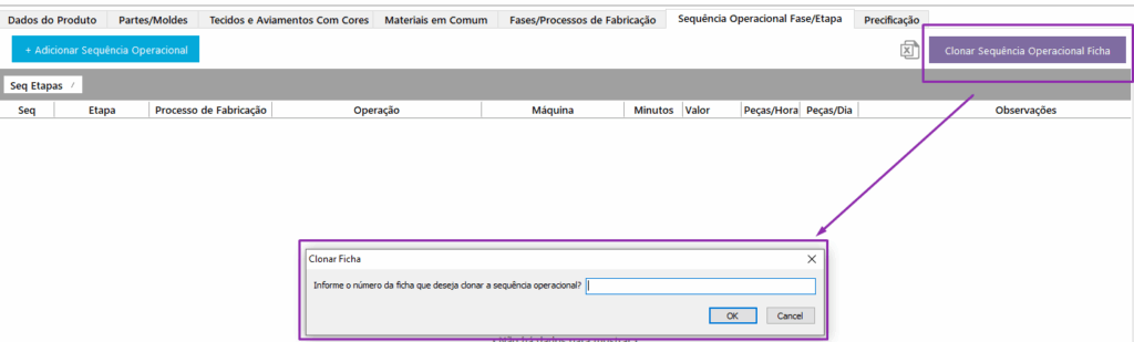 Basta clicar no botão “Clonar Sequência Operacional Ficha” e informar o número da ficha desejada.