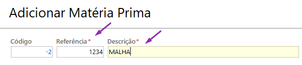 3. Informe a referência e a descrição da matéria-prima.