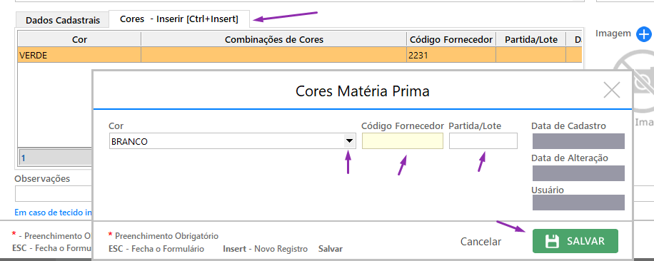 9. Para adicionar as cores (o cadastro precisa ser salvo antes de incluir as cores):