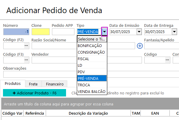 1. Acesse a tela “Pedido de Venda”