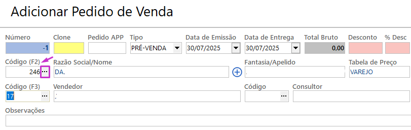 (Tem três formas de adicionar o cliente: pressionando F2, clicando nos três pontinhos ou informando diretamente o código do cliente)