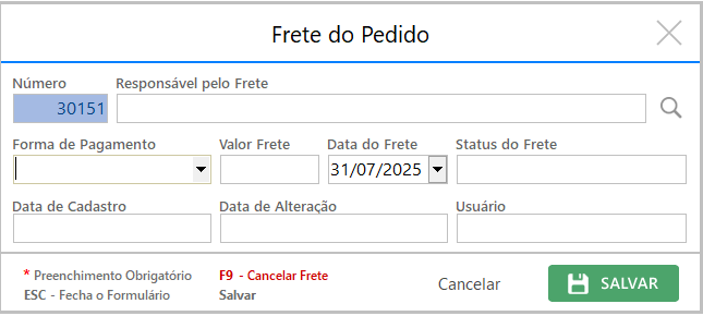 Vá até a aba Frete e clique em “Adicionar Frete” ou pressione Ctrl + F.