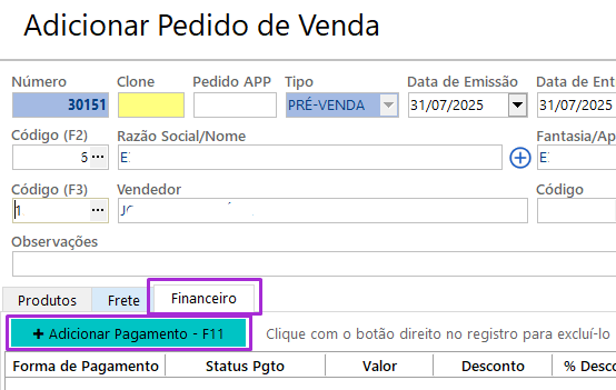 Acesse a aba Financeiro e clique em “Adicionar Pagamento” ou pressione F11.