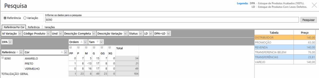 Referência: mostra a quantidade detalhada por cor e tamanho.