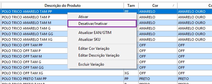 4. Clique com o botão direito sobre a variação que deseja inativar e selecione a opção Desativar/Inativar.