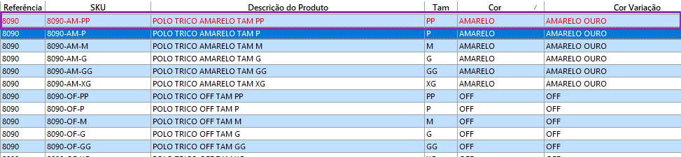 A variação será inativada, é possível identificar as variações inativas pela cor vermelha. Repita o processo para todas as variações que deseja inativar.